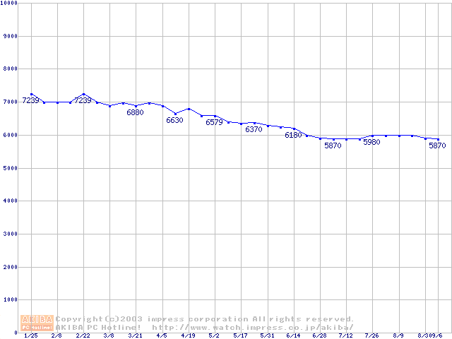 | [↑前グラフ]: | HDD 20GB~30GB未満(5400rpmクラス)の最安値推移 |