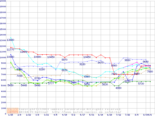 メモリ主要製品(最安値5千円~1万円未満)の最安値推移