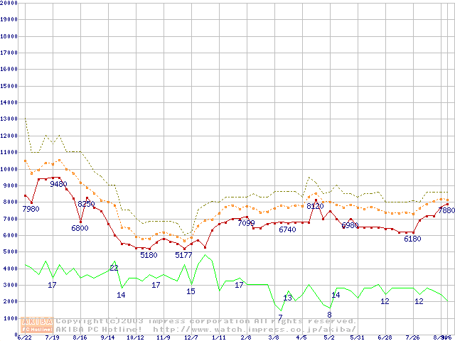 PC133 SDRAM DIMM CasLatency=2の最安値推移