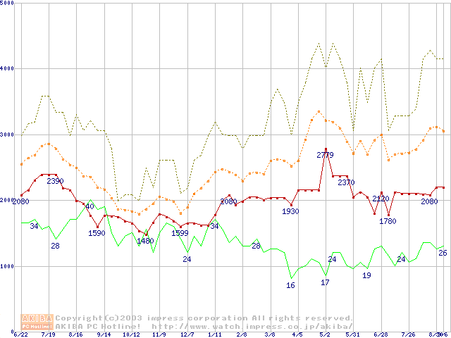 PC133 SDRAM DIMM CasLatency=3の最安値推移