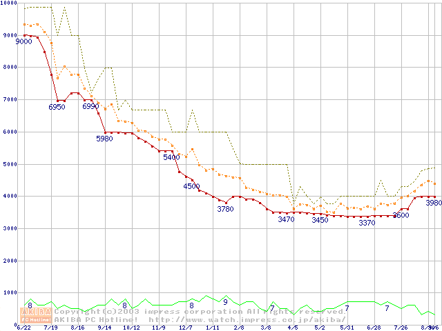 Socket A (PGA,FSB 200MHz,L2 256KB,Thunderbird)の最安値推移
