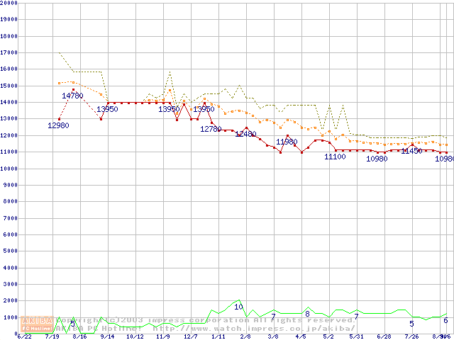 Socket 370 (FC-PGA,FSB 133MHz,L2 256KB,Coppermine)の最安値推移