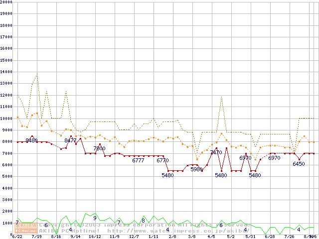 PC133 SDRAM DIMM CasLatency=3 ECC対応 Registeredタイプの最安値推移