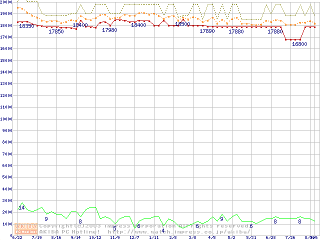 Socket 370 (FC-PGA2,FSB 133MHz,L2 512KB,Tualatin)の最安値推移