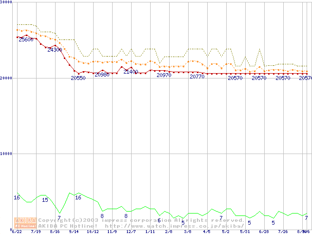 Socket 370 (FC-PGA2,FSB 133MHz,L2 512KB,Tualatin)の最安値推移