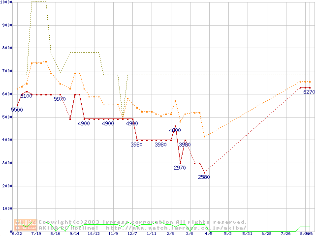 PC100 SDRAM DIMM CasLatency=2 ECC対応 Registeredタイプの最安値推移