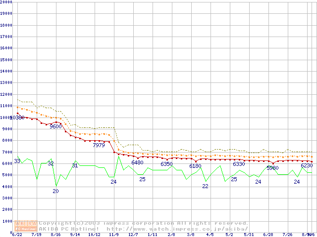 Socket 478 (micro-PGA,FSB 400MHz,L2 128KB,Willamette)の最安値推移