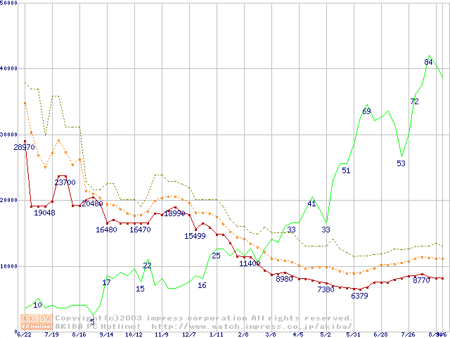 PC3200(DDR400) DDR SDRAM DIMMの最安値推移