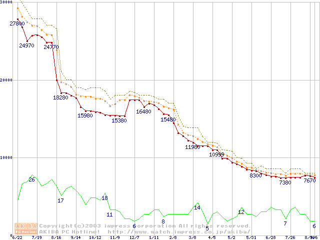 Socket A (OPGA,FSB 266MHz,L2 256KB,Thoroughbred)の最安値推移