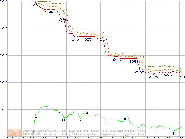 Socket 478 (micro-PGA,FSB 400MHz,L2 512KB,Northwood)の最安値推移