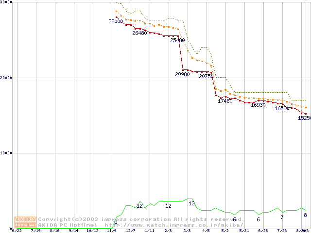 Socket A (OPGA,FSB 266MHz,L2 256KB,Thoroughbred)の最安値推移