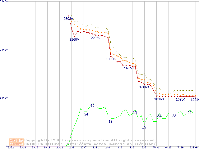 Socket A (OPGA,FSB 266MHz,L2 256KB,Thoroughbred)の最安値推移