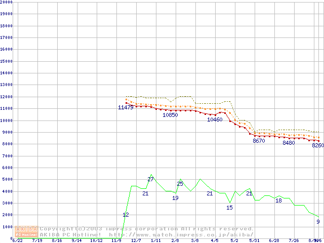 Socket 478 (micro-PGA,FSB 400MHz,L2 128KB,Northwood)の最安値推移