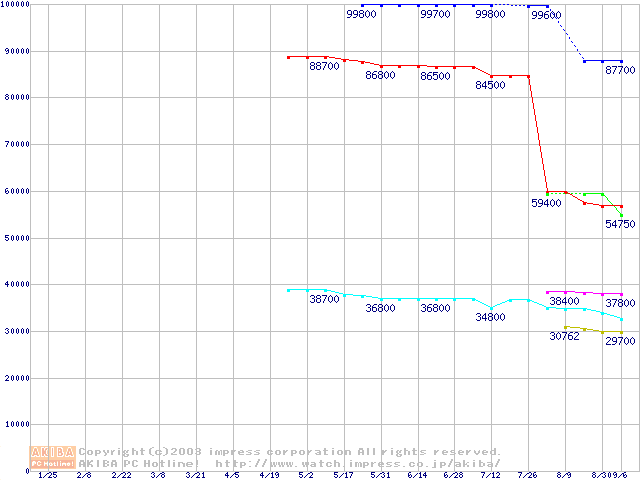 | [↓次グラフ]: | Socket A (OPGA,FSB 266MHz,L2 512KB,Barton)の最安値推移 |