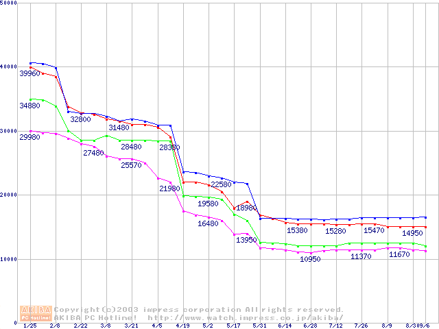 | Socket A (OPGA,FSB 333MHz,L2 256KB,Thoroughbred)の最安値推移 |