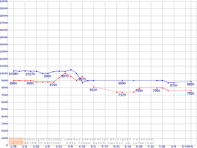 | [↑前グラフ]: | Socket A (OPGA,FSB 266MHz,L2 256KB,Thoroughbred)の最安値推移 |