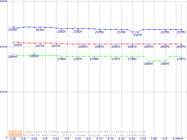 | [↑前グラフ]: | Socket 478 (micro-PGA,FSB 400MHz,L2 128KB,Willamette)の最安値推移 |