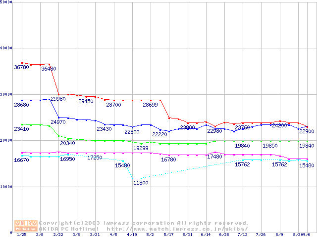 | [↑前グラフ]: | Socket 478 (micro-PGA,FSB 533MHz,L2 512KB,Northwood)の最安値推移 |