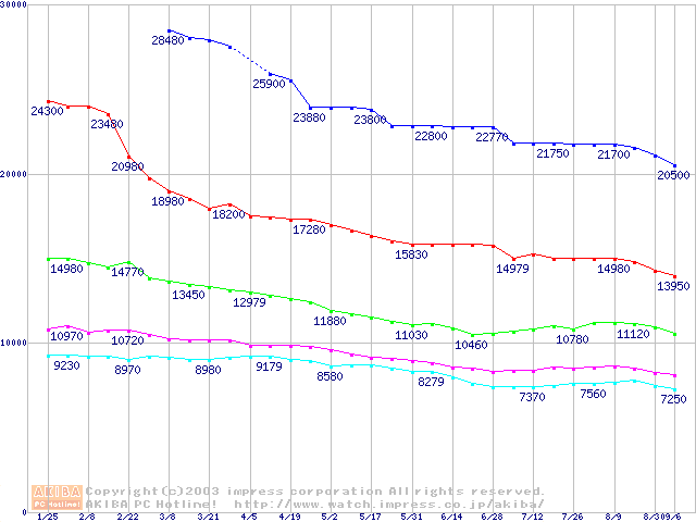 | [↑前グラフ]: | DiamondMax Plus 9 (7200rpm,8MB,UltraATA/133,FDB)の最安値推移 |