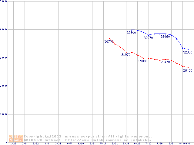 | [↑前グラフ]: | DiamondMax Plus 8 (7200rpm,2MB,UltraATA/133,FDB)の最安値推移 |