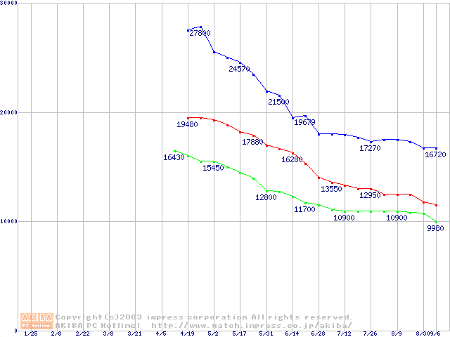 | [↑前グラフ]: | Fireball 3 (5400rpm,UltraATA/133,2MB,FDB)の最安値推移 |