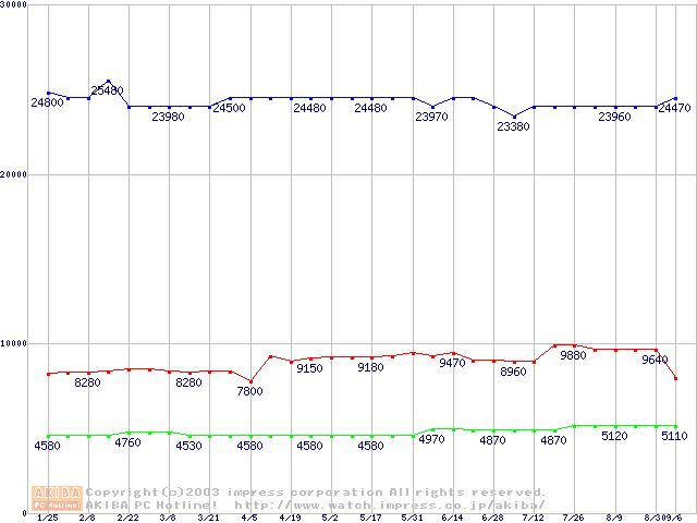 | [↓次グラフ]: | PC800-40 DRDRAM RIMM ECC対応の最安値推移 |