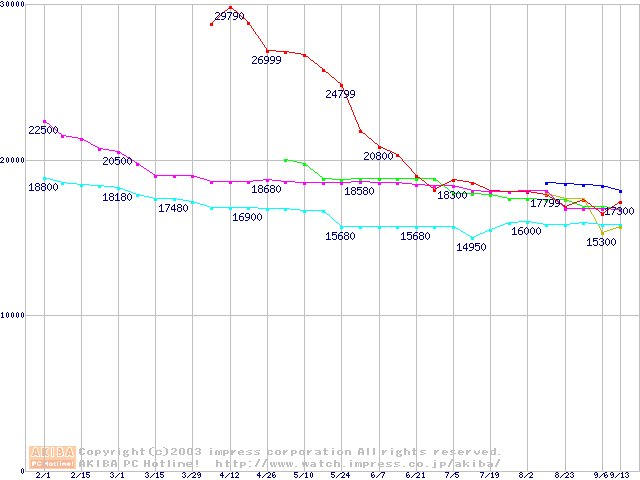 | [↓次グラフ]: | 2.5インチHDD主要製品(最安値2万円~3万円未満)の最安値推移 |
