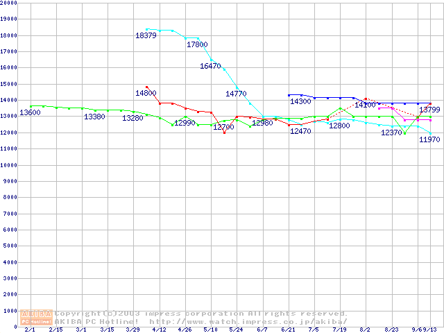 | [↑前グラフ]: | 2.5インチHDD 30GB~40GB未満(9.5mm厚)の最安値推移 |