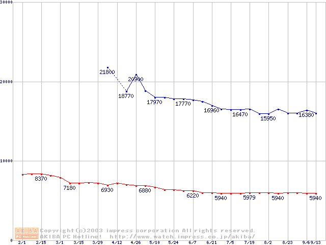 | [↓次グラフ]: | HDD 40GB~50GB未満(7200rpmクラス)の最安値推移 |