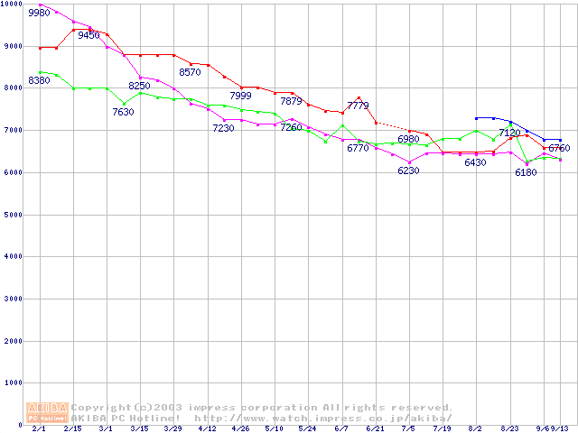 | [↓次グラフ]: | HDD 60GB~80GB未満(7200rpmクラス)の最安値推移 |