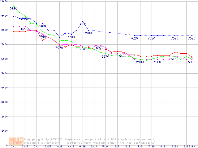 | [↓次グラフ]: | HDD 60GB~80GB未満(5400rpmクラス)の最安値推移 |