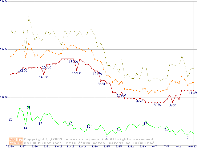 PC2100(DDR266) DDR SDRAM DIMM ECC対応 Registeredタイプの最安値推移