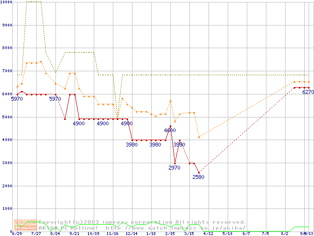 PC100 SDRAM DIMM CasLatency=2 ECC対応 Registeredタイプの最安値推移