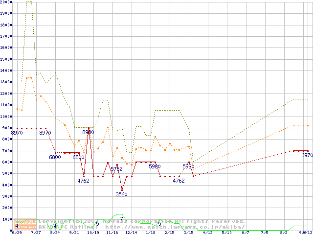 PC100 SDRAM DIMM CasLatency=2 ECC対応 Registeredタイプの最安値推移