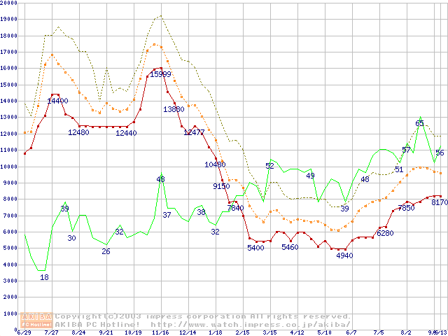 PC2700(DDR333) DDR SDRAM DIMMの最安値推移