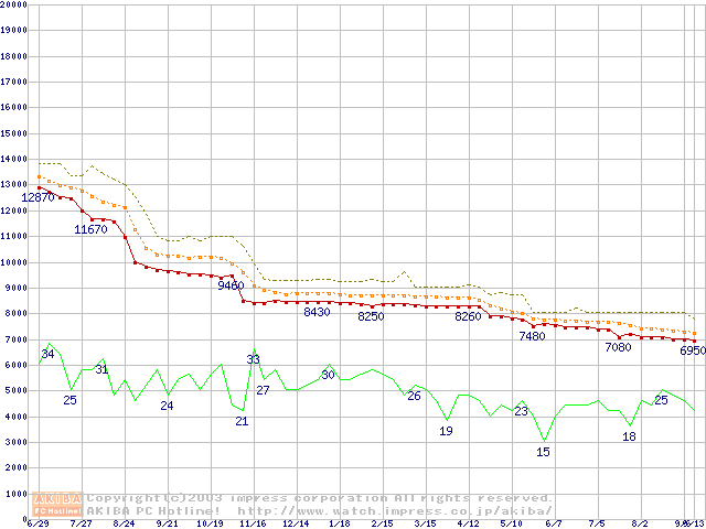 Socket 478 (micro-PGA,FSB 400MHz,L2 128KB,Willamette)の最安値推移