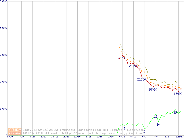 Travelstar 80GN (9.5mm,4200rpm,UltraATA/100,8MB,FDB,40GB/Platter)の最安値推移