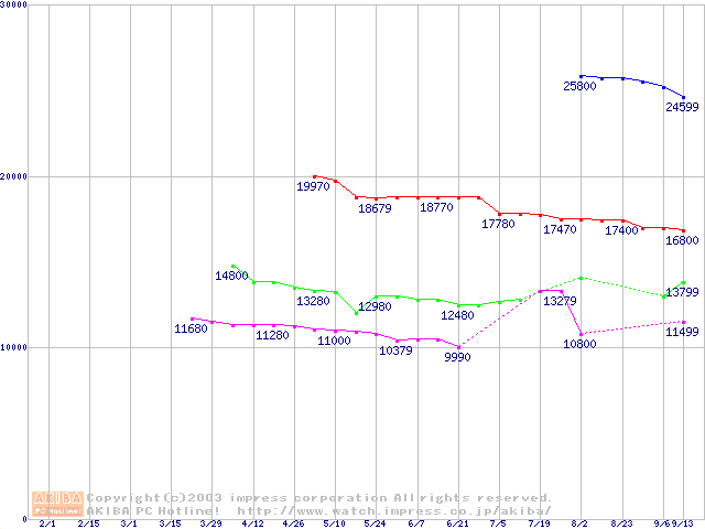 | [↑前グラフ]: | MKシリーズ (9.5mm,4200rpm,2MB,FDB,20GB/Platter)の最安値推移 |