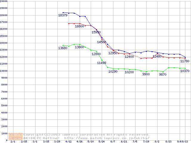 | [↑前グラフ]: | Travelstar 80GN (9.5mm,4200rpm,UltraATA/100,8MB,FDB,40GB/Platter)の最安値推移 |