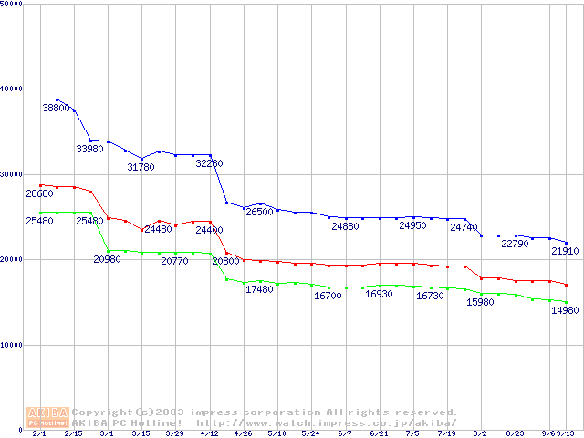 | Socket A (OPGA,FSB 266MHz,L2 256KB,Thoroughbred)の最安値推移 |