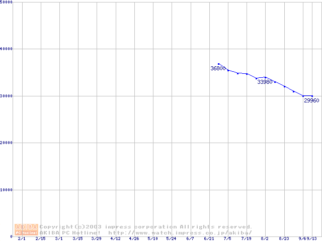 | [↑前グラフ]: | Deskstar 180GXP (7200rpm,2MB,UltraATA/100,FDB)の最安値推移 |