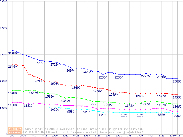 | [↑前グラフ]: | MaXLine Plus II (7200rpm,8MB,UltraATA/133,FDB)の最安値推移 |