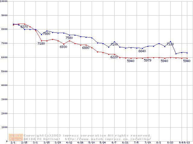 | [↑前グラフ]: | DiamondMax Plus 9 (7200rpm,2MB,UltraATA/133,FDB)の最安値推移 |