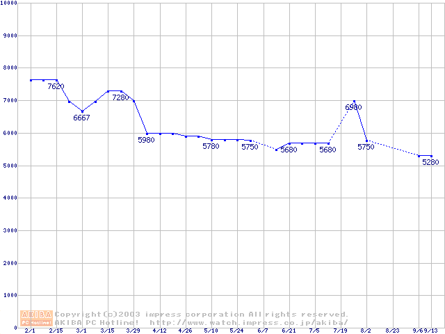 | [↓次グラフ]: | PC2100(DDR266) DDR SDRAM DIMM ECC対応の最安値推移 |