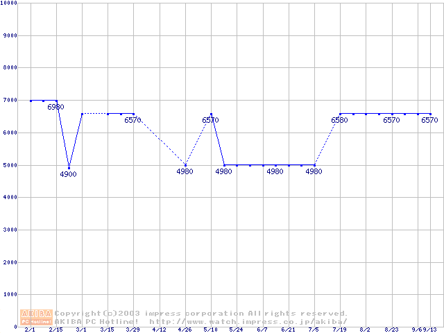 | [↓次グラフ]: | PC100 SDRAM DIMM CasLatency=2 ECC対応 Registeredタイプの最安値推移 |