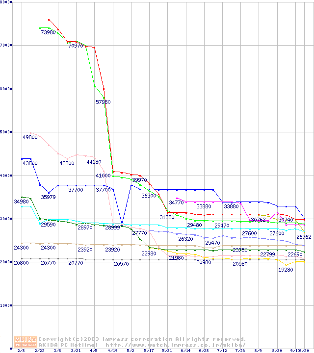 CPU主要製品(最安値1万円~2万円未満)の最安値推移