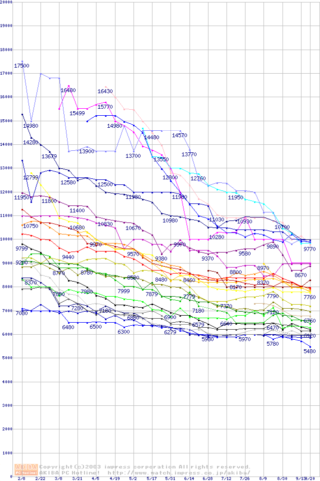 HDD主要製品(最安値1万円~1万5千円未満)の最安値推移