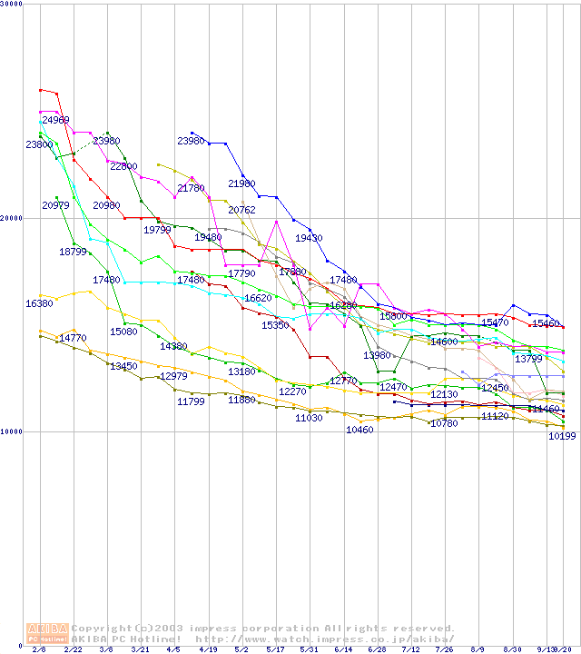 HDD主要製品(最安値1万5千円~2万円未満)の最安値推移