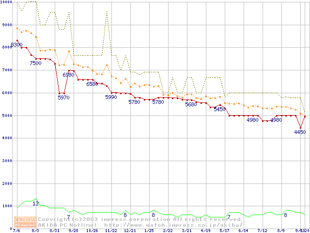 Socket A (PGA,FSB 266MHz,L2 256KB,Thunderbird)の最安値推移
