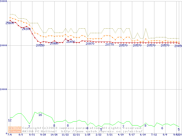 Socket 370 (FC-PGA2,FSB 133MHz,L2 512KB,Tualatin)の最安値推移